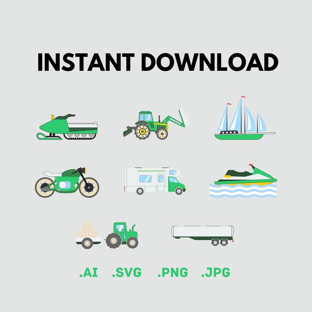• Diverse Collection: Includes Tractor, Forklift, Jetski, Snowmobile, Sailboat, Caravan, Tank, and Motorcycle icons.