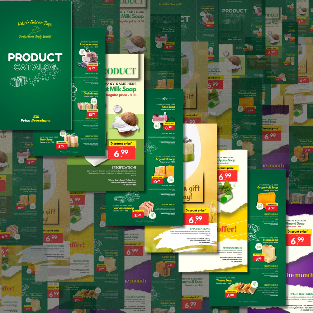Elevate your business presentation with our comprehensive handmade soap wholesale catalog/brochure, expertly crafted for showcasing your products. This template is an indispensable tool for small business owners, manufacturers, wholesalers, and brands, offering a clean and consistent design for effortless readability.