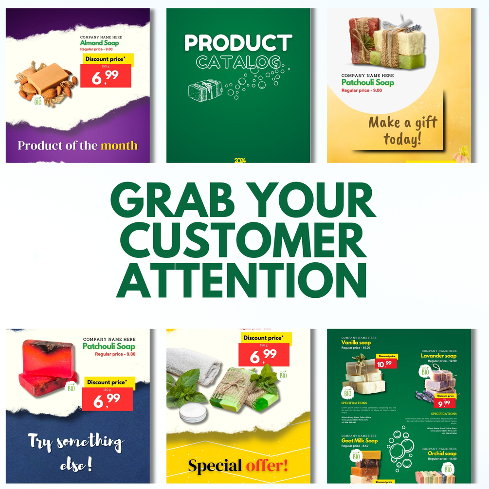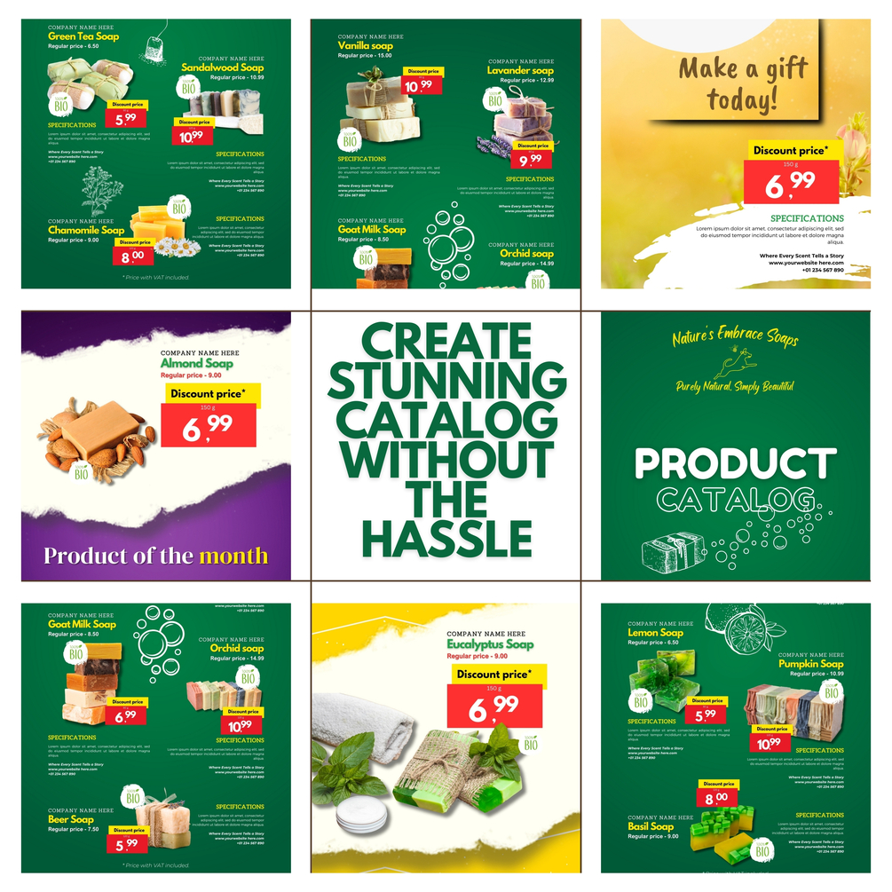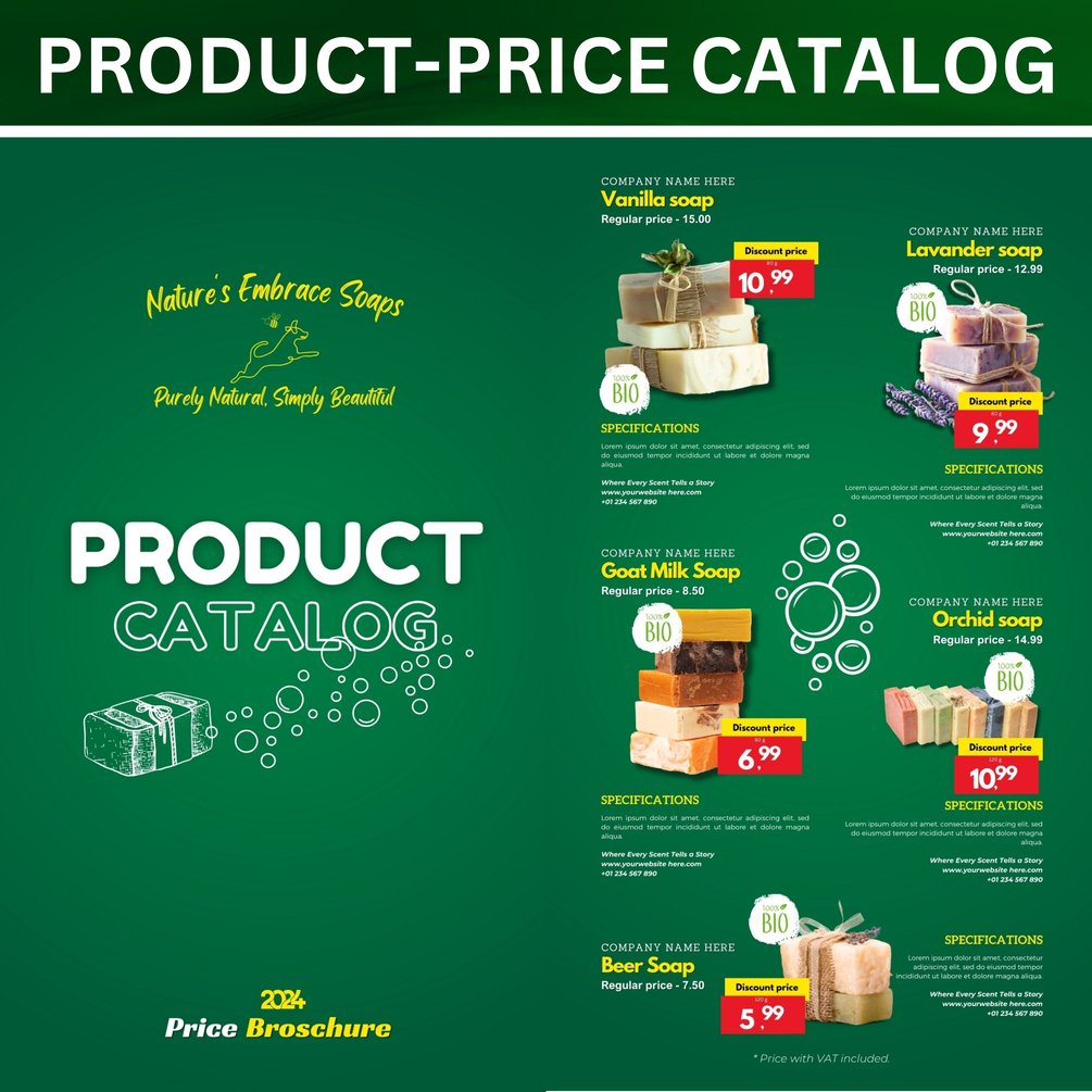 Elevate your business presentation with our comprehensive handmade soap wholesale catalog/brochure, expertly crafted for showcasing your products. This template is an indispensable tool for small business owners, manufacturers, wholesalers, and brands, offering a clean and consistent design for effortless readability.